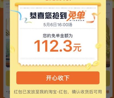 3、然后就可以查看到自己的免单资格,点击【开心收下】。