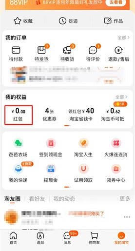 4、在我的页面点击【红包】就可以查看红包然后使用了。